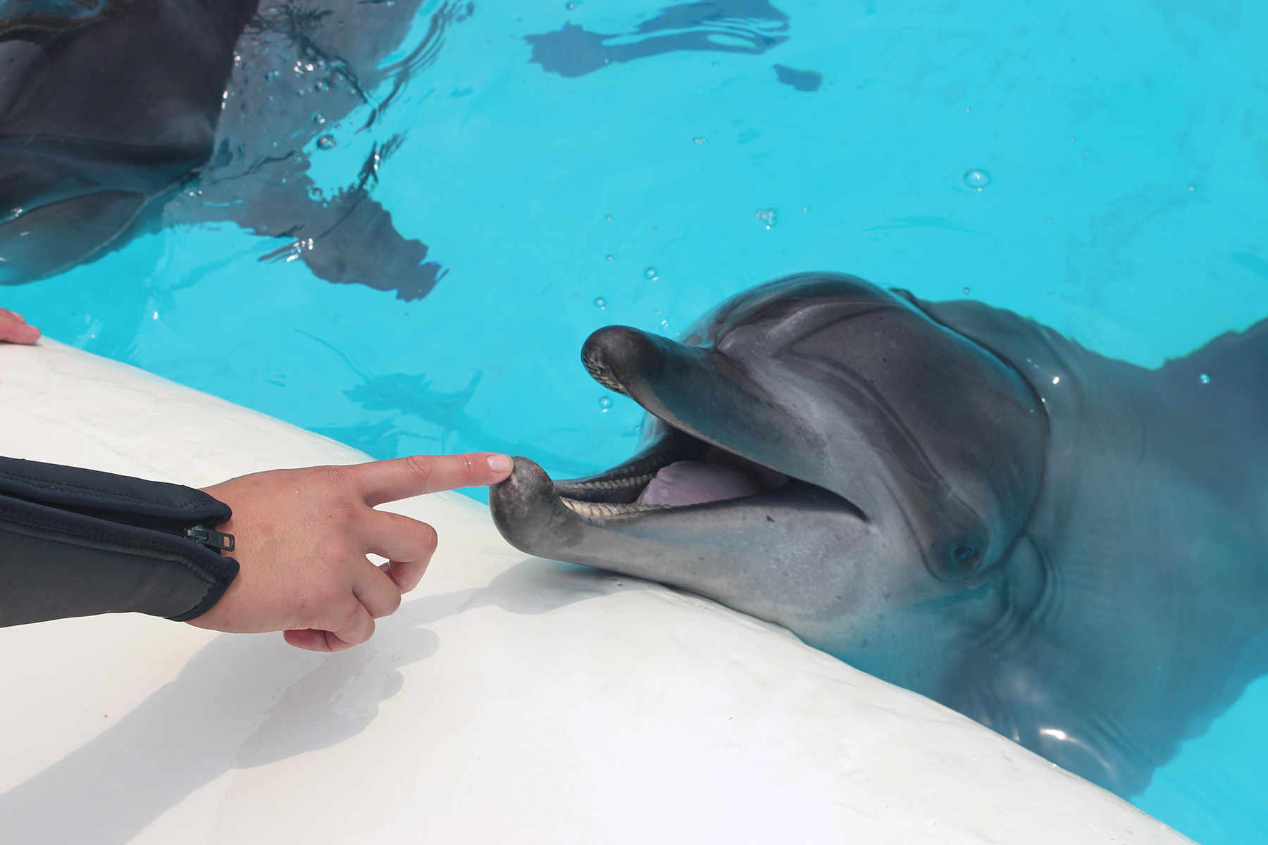 我們將目標物設定為「手」。先用手碰海豚的吻部,並吹哨給予獎勵,讓海豚夥伴知道要碰到手喔 ! 然後就可以將手放在離海豚吻部較近的方,海豚夥伴就會理解「要碰訓練師的手」了 !