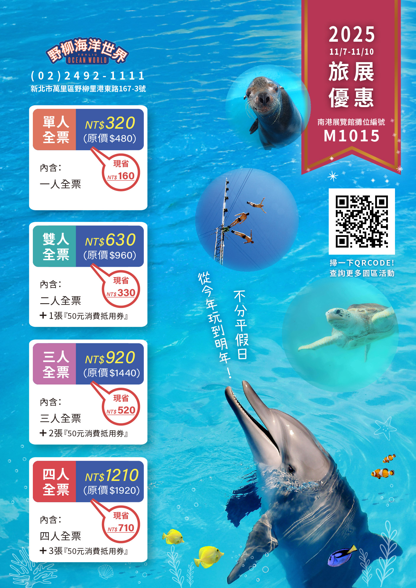 2025 ITF台北國際旅展即將盛大展出! 野柳海洋世界參展年度最優惠! 旅展現場購買票券,平日、假日、過年皆可使用!